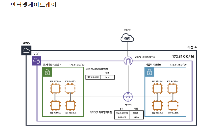 라우터에서 라우팅 테이블을 보고 네트워크는 요청처리함. 외부로 통하는 트래픽은 인터넷 게이트웨이 사용