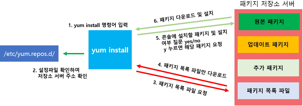 2번 : /etc/yum.repos.d/ 디렉터리의 여러 설정 파일 들 및 CentOS-Base.repo 파일을 참고하여 인터넷상의 패키지 저장소 서버 주소를 얻는다.