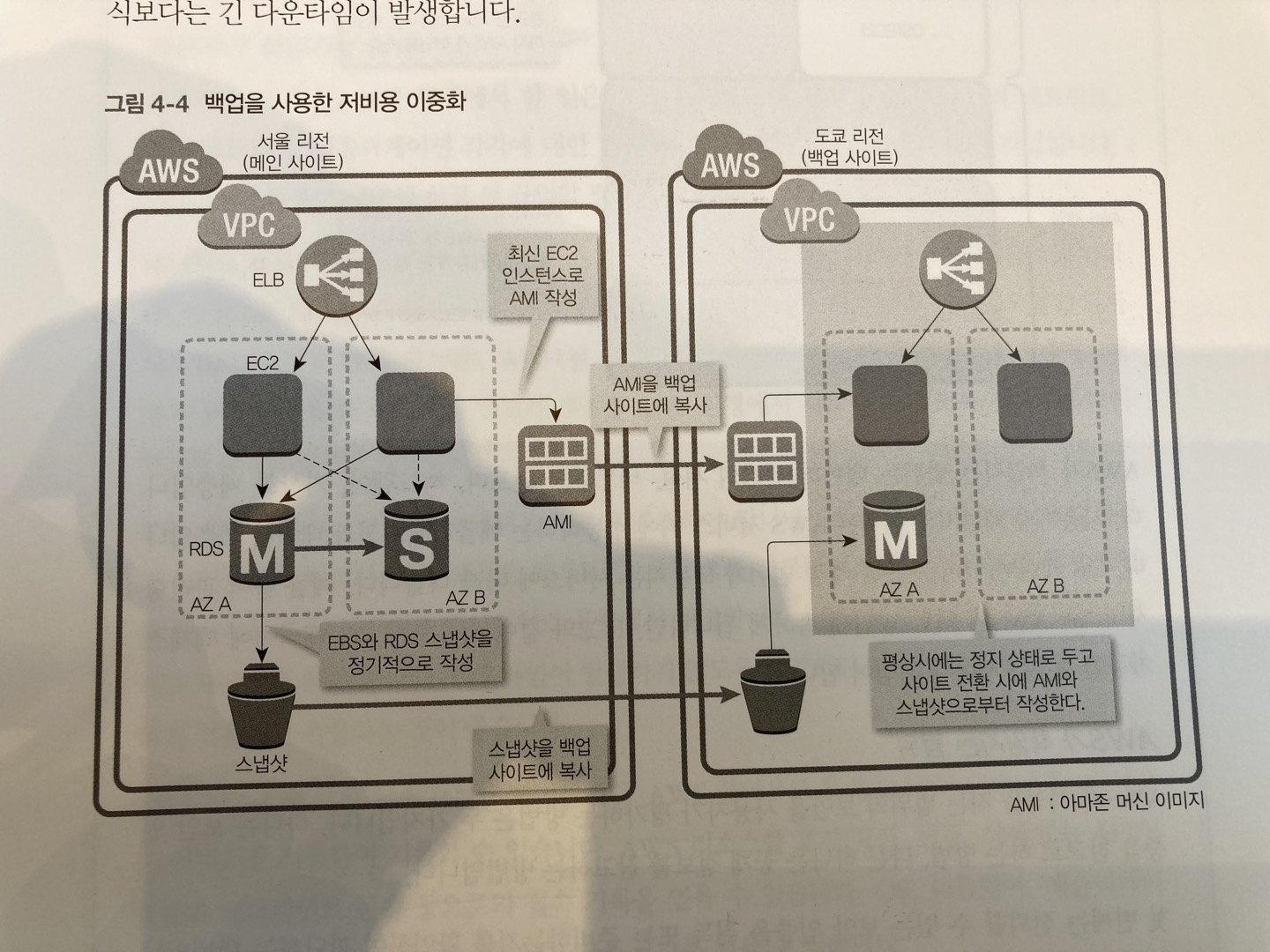 EC2 인스턴스의 바탕이 되는 아마존 머신 이미지(AMI)를 백업 사이트로 복사해두고 EBS, RDS, S3의 데이터를 백업 사이트에 보관해야 한다. 매인 사이트 전체에 영향을 주는 장애가 발생한 경우 AMI에서 EC2 인스턴스를 생성하고 EBS와 RDS는 스냅숏으로 부터 데이터를 복원한다. ELB나 클라우드 워치를 메인 사이트와 같은 설정으로 작성하면 메인 사이트와 동일한 구성의 백업 사이트를 작성할 수 있다.