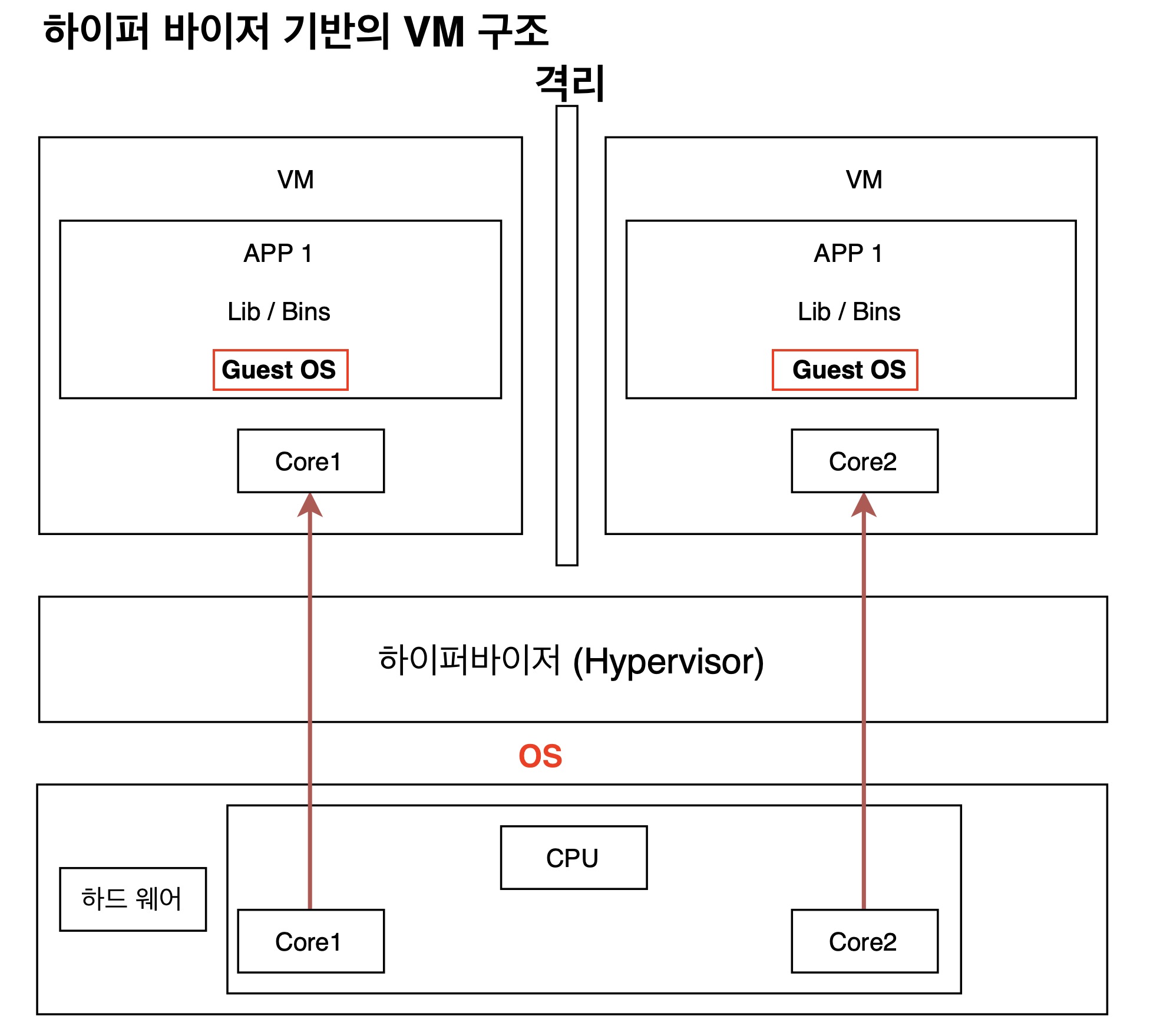 많이 사용하는 VM 구조는 기존 OS 위에서 하이퍼 바이저를 사용하는 방식이다. 예를 들어 윈도우 PC에서 VMware 설치한 후 거기에서 ubuntu OS를 설치하는 구조.
