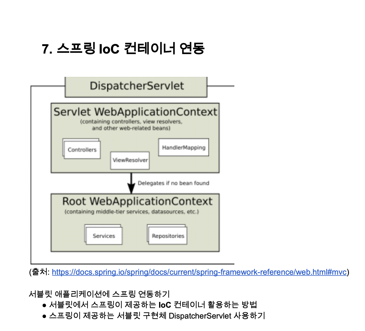 - DispatcherServlet에서 공통 빈을 필요로 하는 경우 ContextLoaderListener에 설정해주면 된다.(아래 예시)