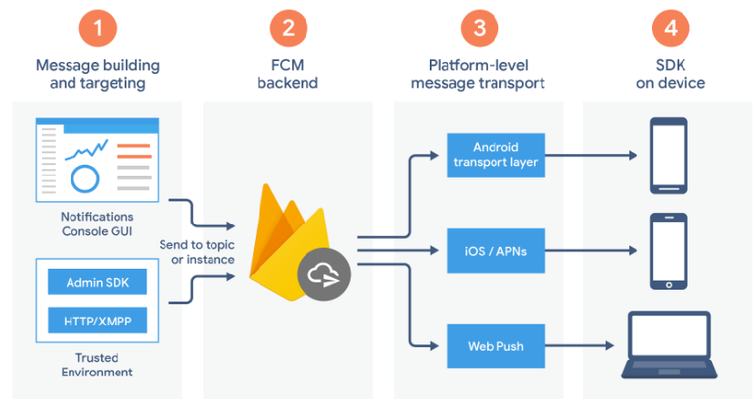 1번 요소는 메세지를 작성하고 FCM backend에 전송할 애플리케이션 서버를 의미하며, 2번 요소는 FCM backend로부터 메세지를 수신할 클라이언트의 앱을 의미한다.