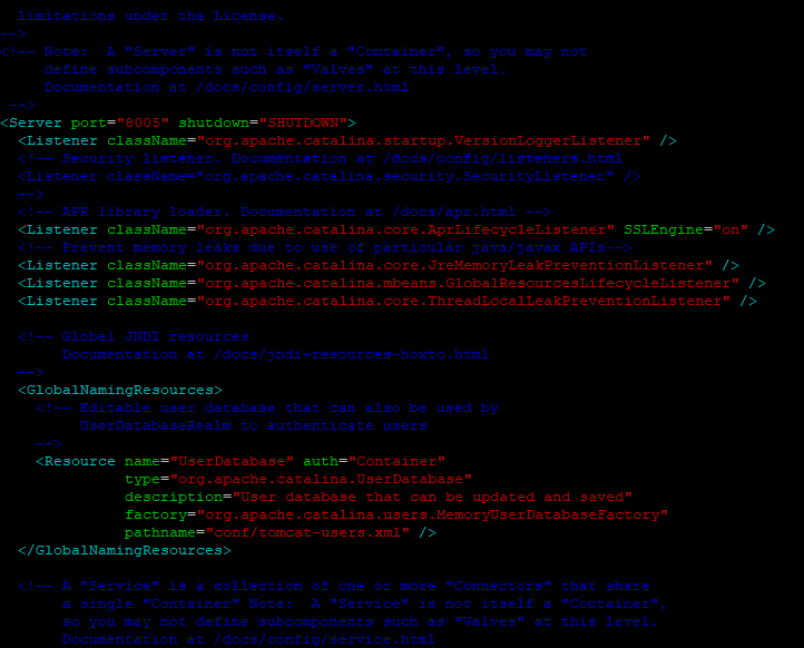 server.xml 은 톰캣이 실행시 필요한 정보를 정의한 파일이다. 포트 정보, DB 접속정보, 웹 리소스(ex. jsp, image 파일) 참조경로, 이벤트 리스너(event listener) 등을 설정한다.