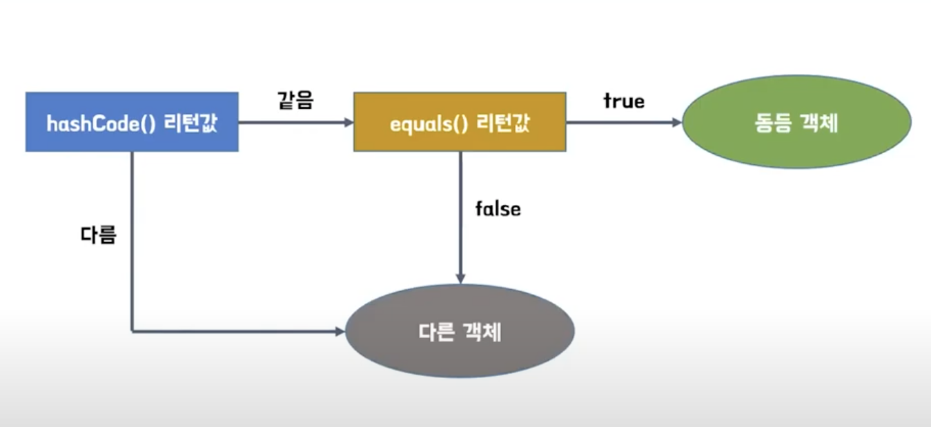 - hashCode리턴값이 같으면 equals()리턴값도 같은지 파악 후 둘다 같을 경우 동등객체로 취급(완전한 vo는 이 두개 메서드 오버라이딩 해줘야 한다.)