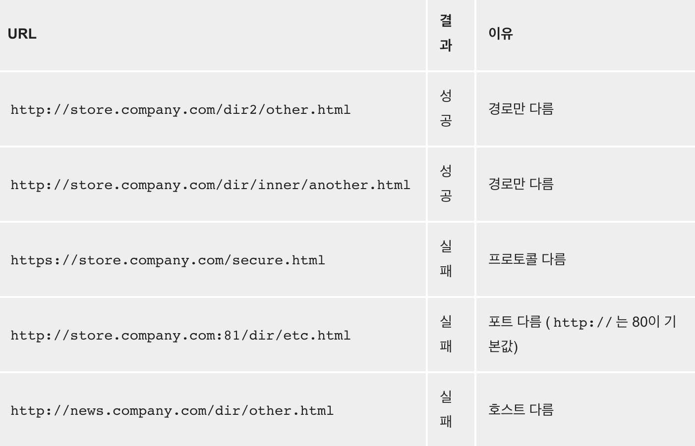 출처란? : 프로토콜, host, port를 통해 같은 출처인지 다른 출처인지 판단할 수 있다.