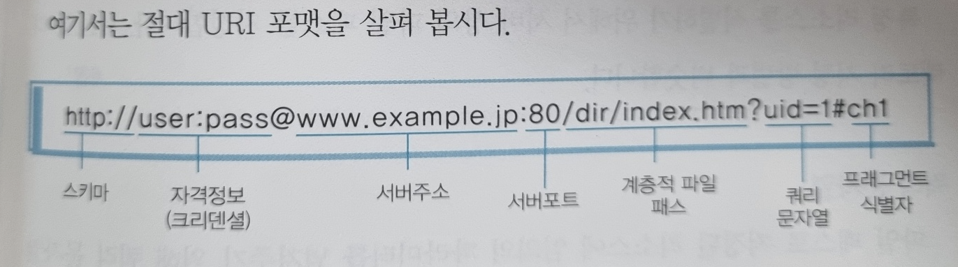 6) 프래크 먼트 식별자 : 주로 취득한 리소스에서 서브 리소스(도큐먼트 중간에 위치)를 가리키기 위해서 프래그먼트 식별자가 사용됨.