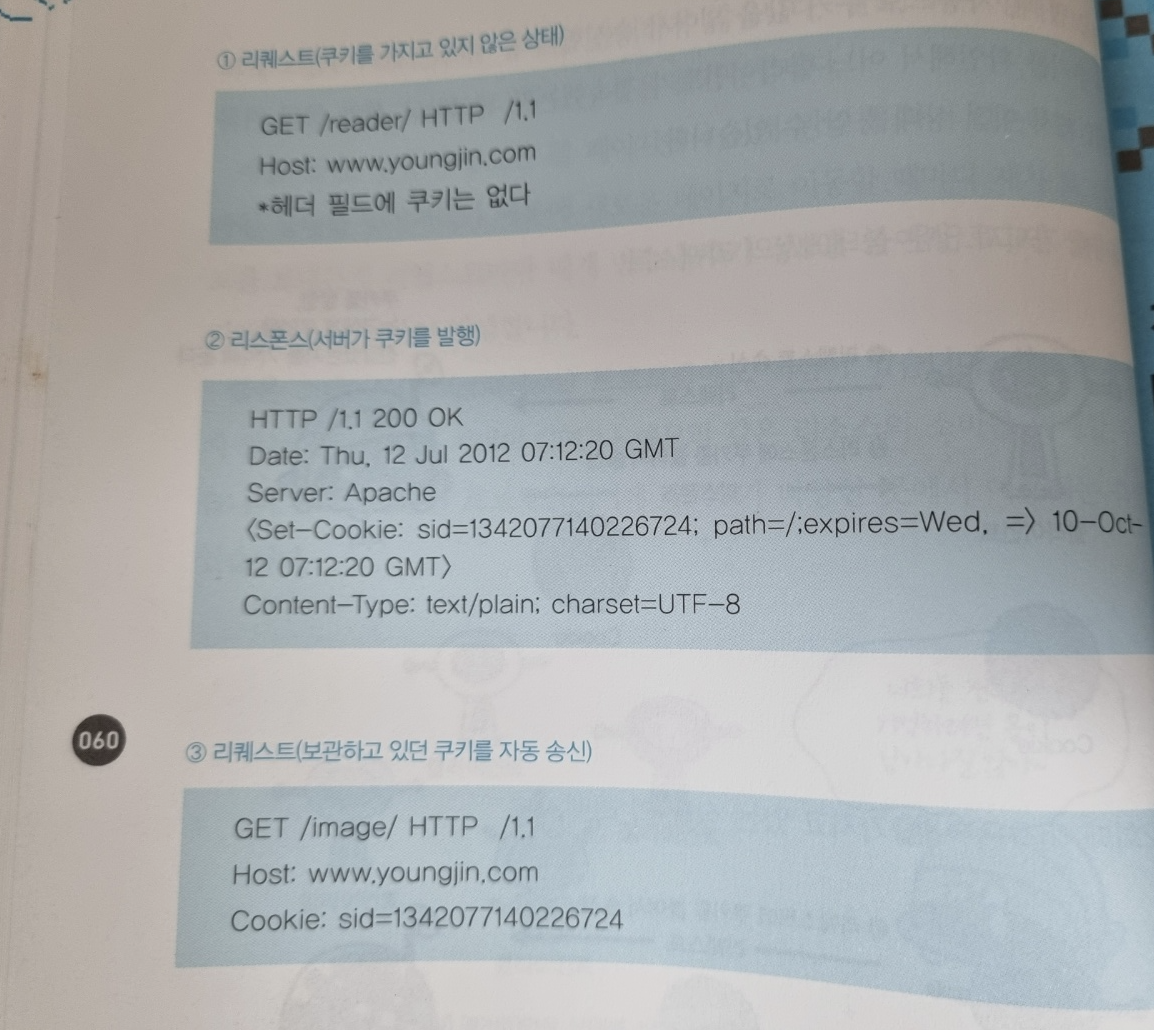 1) HTTP는 상태를 유지하지 않는 stateless 프로토콜이다. HTTP 프로토콜 독자적으로 Request와 Response를 교환하는 동안에 상태를 관리하지 않는다. 이를 보완하기 위해 쿠키가 등장(쇼핑몰에서 로그인 후 다른 사이트로 이동해도 로그인 상태 유지되도록)